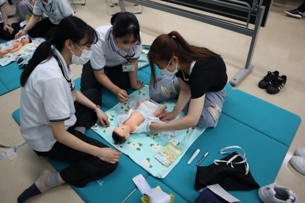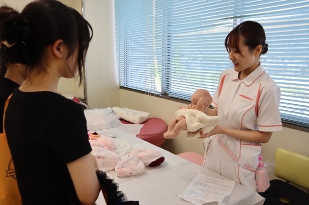 赤ちゃん人形を使って、在校生と一緒に 保健師の家庭訪問演習を行いました。 |