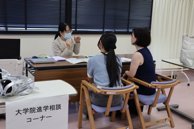 そのほか、昨年度に引き続き、教員による「助産師・保健師説明会」や教員および学生による「個別相談会」も開催しました。入試やカリキュラム、実習内容、学生生活、さらには大学院進学に関することまで、多岐にわたる質問が飛び交い、会場は活気にあふれていました。