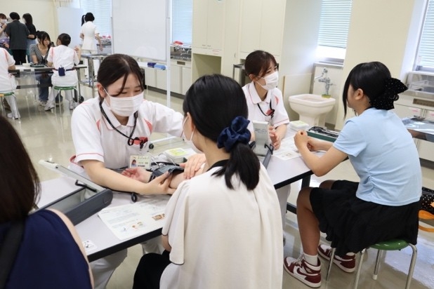 在校生が血圧を測りながら、高校生に 声をかけ、質問に答える場面が見られ ました。 |
