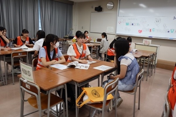 教員が災害時に役立つビニールの買い 物袋を使用したオムツの制作方法を説 明し、高校生は在校生の支援のもとで 赤ちゃん人形に装着していました。 |