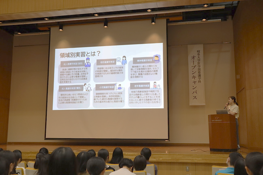 2日目の8月8日(金)の午前中には、岐阜大学講堂にて「看護学科説明会」を実施しました。会場は満席となり、多くの高校生や保護者の皆様にご参加いただきました。「在校生のメッセージ」では、1年生から4年生の在校生が、それぞれの学びや学生生活の体験を、スライドを用いてわかりやすく紹介しました。高校生の中には、真剣にメモを取り、質問をして熱心に話を聞く姿も見られました。